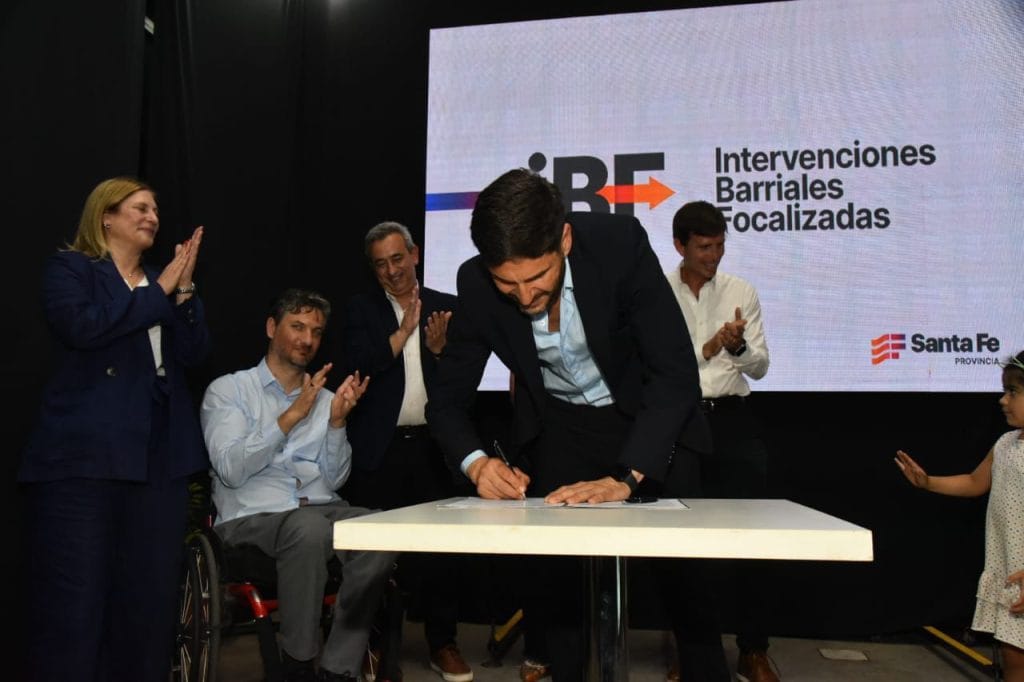 El intendente Pablo Javkin y el gobernador Maximiliano Pullaro presentaron este martes 29 de octubre los resultados de los trabajos integrales que se llevaron a cabo en los barrios Stella Maris y La Bombacha, a través del programa Intervención Barrial Focalizada (IBF), como también anunciaron las obras de mejoras que se realizarán en el marco del Plan Abre. Durante el acto, que tuvo lugar en el galpón de los ex-combatientes de Acevedo 1021 bis, también se firmó el convenio del primer Consorcio Social.