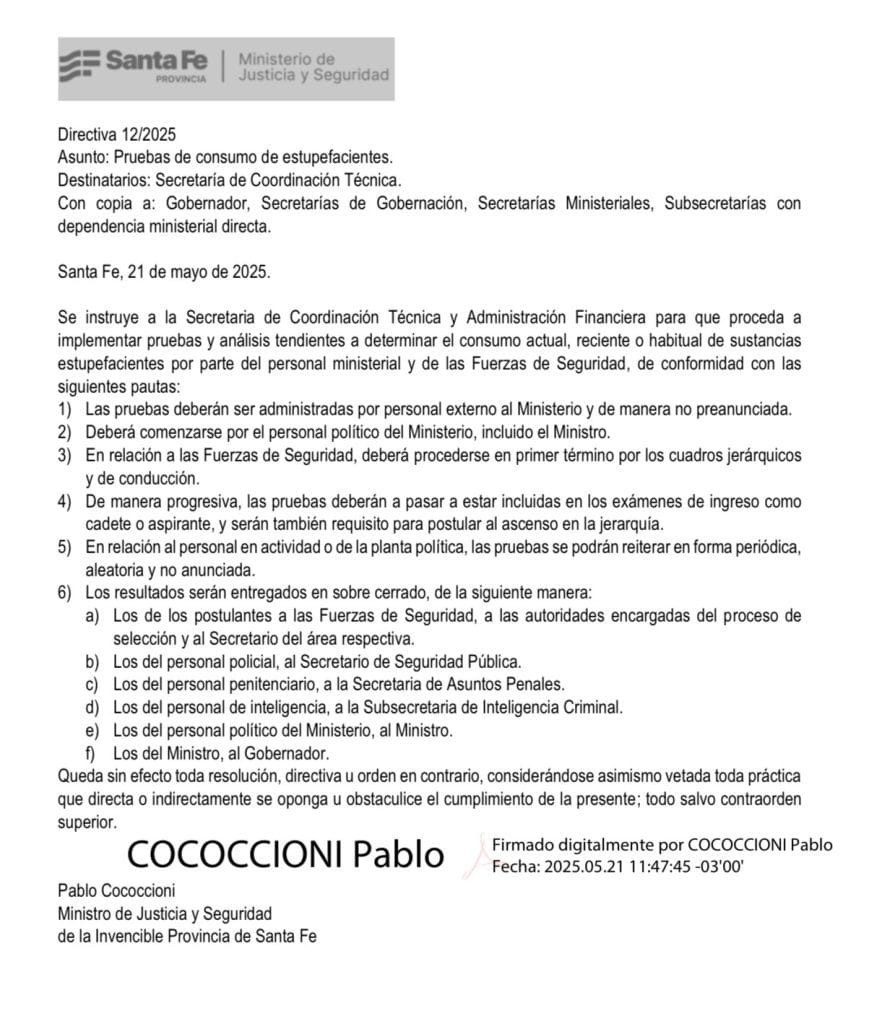 La medida fue oficializada este miércoles por el Ministerio de Justicia y Seguridad de la provincia de Santa Fe, mediante una resolución firmada por el ministro Pablo Cococcioni, que dispuso la realización de test de consumo de drogas a sus funcionarios y al personal policial. Se ejecutará de manera progresiva: primero, con integrantes del gabinete ministerial y jefes de las fuerzas, para luego extenderse a cadetes y aspirantes a la carrera policial.