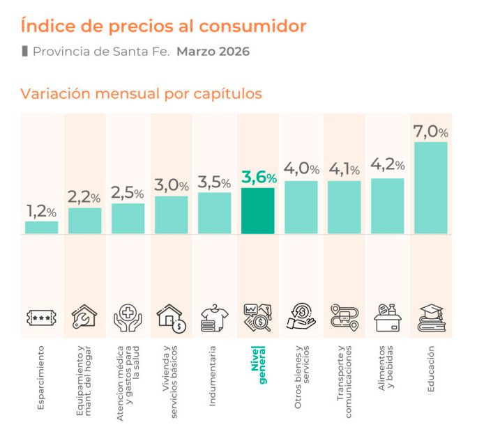 Según el último informe del Instituto Provincial de Estadística y Censos (IPEC), el Índice de Precios al Consumidor de Santa Fe registró en marzo de 2026 una suba del 3,6% mensual, con un acumulado del 9,3% en el primer trimestre y un 32,7% interanual . A pesar de estos niveles, el impacto sobre el consumo sigue siendo negativo.